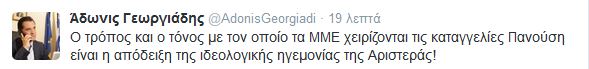 Ο κ.Γεωργιάδης, με μήνυμά του στο Twitter, έγραψε: «Ο τρόπος και ο τόνος με τον οποίο τα ΜΜΕ χειρίζονται τις καταγγελίες Πανούση είναι η απόδειξη της ιδεολογικής ηγεμονίας της Αριστεράς».