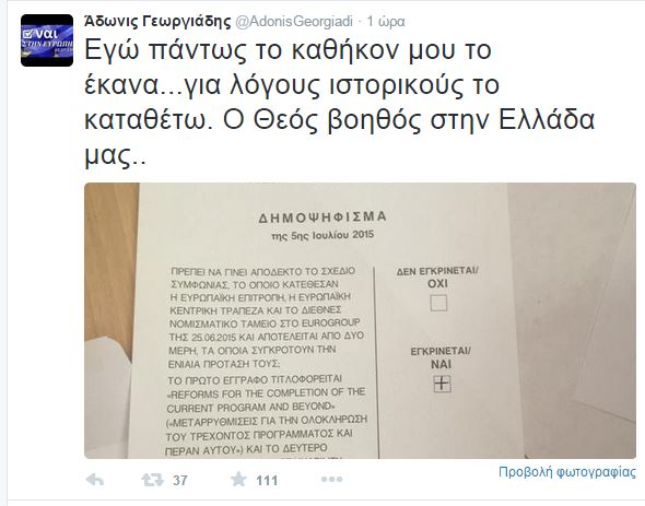 Ο βουλευτής της ΝΔ Άδωνις Γεωργιάδης φωτογράφισε το ψηφοδέλτιο του με σταυρωμένη την απάντηση «Ναι» και έγραψε στο twitter: «Εγώ πάντως το καθήκον μου το έκανα… Για λόγους ιστορικούς το καταθέτω. Ο Θεός βοηθός στην Ελλάδα μας»