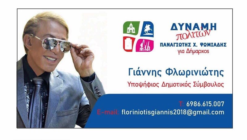 Υποψήφιος δημοτικός σύμβουλος με τον συνδυασμό του Παναγιώτη Ψωμιάδη «Δύναμη Πολιτών», θα είναι ο γνωστός τραγουδιστής, Γιάννης Φλωρινιώτης.Ο τραγουδιστής ενημέρωσε τους διαδικτυακούς του φίλους για την απόφασή του, κοινοποιώντας την κάρτα της υποψηφιότητάς του στο Facebook.Δείτε την φωτογραφία που ανάρτησε: