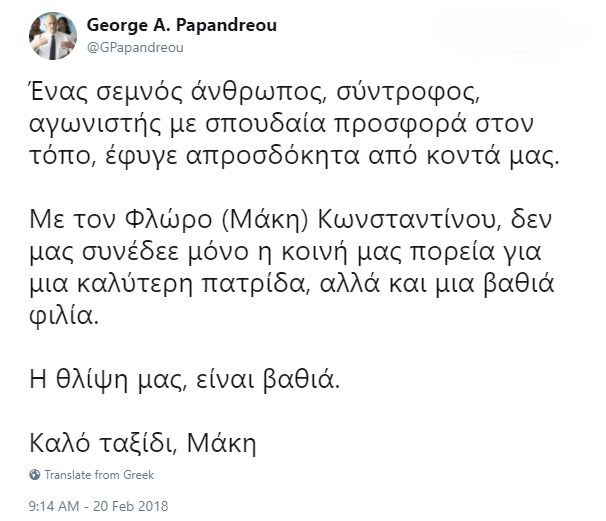 «Ένας σεμνός άνθρωπος, σύντροφος, αγωνιστής με σπουδαία προσφορά στον τόπο, έφυγε απροσδόκητα από κοντά μας. Με τον Φλώρο (Μάκη) Κωνσταντίνου, δεν μας συνέδεε μόνο η κοινή μας πορεία για μια καλύτερη πατρίδα, αλλά και μια βαθιά φιλία. Η θλίψη μας, είναι βαθιά. Καλό ταξίδι, Μάκη.»