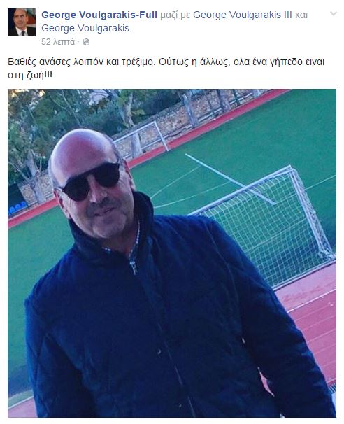 «Βαθιές ανάσες λοιπόν και τρέξιμο. Ούτως η άλλως, όλα ένα γήπεδο είναι στη ζωή», αναφέρει ο Γιώργος Βουλγαράκης, με ανάρτηση του στο Facebook ανεβάζοντας παράλληλα και μία φωτογραφία την ώρα που βρίσκεται στον “αγωνιστικό χώρο”.
