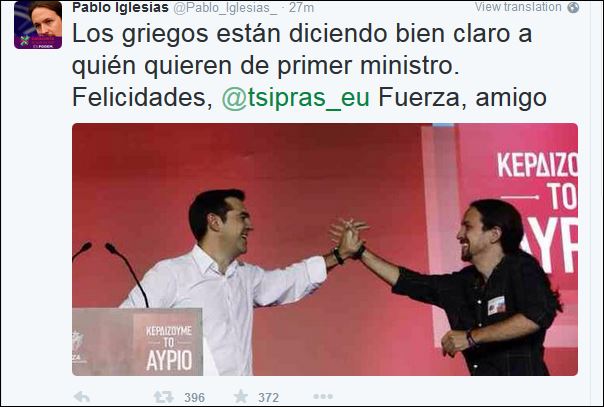 Τα συγχαρητήρια του μέσω twitter έστειλε στον Αλέξη Τσίπρα ο επικεφαλής των Podemos Πάμπλο Ιγκλέσιας: «Οι Έλληνες λένε ξεκάθαρα ποιον θέλουν για πρωθυπουργό. Συγχαρητήρια, καλή δύναμη φίλε», έγραψε ο επικεφαλής των Podemos.