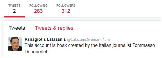 Το μυστήριο σχετικά με τον πλαστό λογαριασμό του Παναγιώτη Λαφαζάνη στο twitter λύθηκε γρήγορα. Δημιουργός του είναι ο Ιταλός δημοσιογράφος Tommaso De Benedetti, o οποίος είναι γνωστός για τις φάρσες που κάνει.