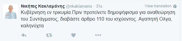 “Κυβέρνηση εν τρικυμία.Πριν προτείνετε δημοψήφισμα για αναθεώρηση του Συντάγματος, διαβάστε άρθρο 110 του ισχύοντος. Αγαπητή Όλγα, καληνύχτα” έγραψε ο βουλευτής της ΝΔ και αντιπρόεδρος της βουλής.