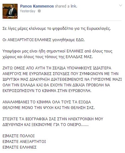 Με μια ανάρτηση στη προσωπική του σελίδα στο facebook ο πρόεδρος των Ανεξάρτητων Ελλήνων Πάνος Καμμένος αναζητά υποψηφίους για το ψηφοδέλτιο του κόμματος για τις επερχόμενες ευρωεκλογές. Ο κ. Καμμένος ψάχνει κυρίως νέους άνεργους με ευρωπαϊκές σπουδές. Δείτε τι έγραψε ο Πάνος Καμμένος στο facebook.