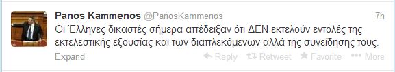 «Οι Έλληνες δικαστές απέδειξαν ότι δεν εκτελούν εντολές της εκτελεστικής εξουσίας και των διαπλεκόμενων αλλά της συνείδησής τους» αναφέρει στον προσωπικό του λογαριασμό στο twitter ο Πρόεδρος των Ανεξάρτητων Ελλήνων, Πάνος Καμμένος, για την υπόθεση του Ταχυδρομικού Ταμιευτηρίου.