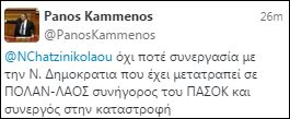 Συγκεκριμένα ο πρόεδρος των Ανεξαρτήτων Ελλήνων έγραψε: “Όχι ποτέ συνεργασία με την Ν. Δημοκρατια που έχει μετατραπεί σε ΠΟΛΑΝ-ΛΑΟΣ συνήγορος του ΠΑΣΟΚ και συνεργός στην καταστροφή”.