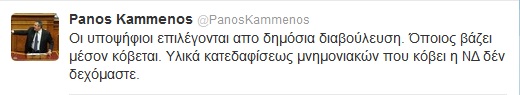 Ο πρόεδρος των Ανεξάρτητων Ελλήνων αναφερόμενος σε πρώην βουλευτές της Νέας Δημοκρατίας, ανακοίνωσε μέσω twitter ότι «οι υποψήφιοι επιλέγονται από δημόσια διαβούλευση. Όποιος βάζει μέσον κόβεται. Υλικά κατεδαφίσεως μνημονιακών που κόβει η ΝΔ δεν δεχόμαστε».