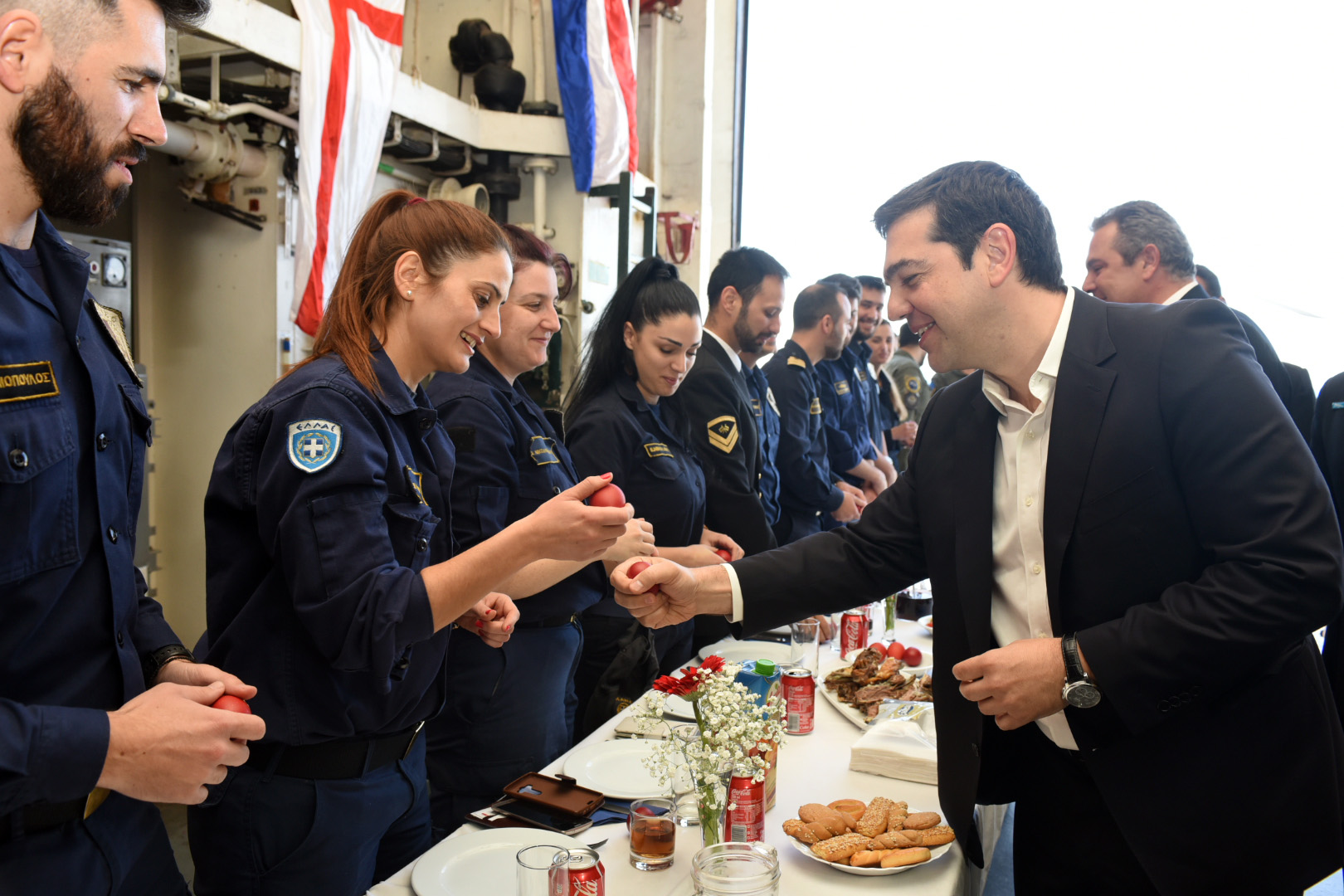 Ο Πρωθυπουργός Αλέξης Τσίπρας, ο Υπουργός Εθνικής Άμυνας Πάνος Καμμένος και ο Αρχηγός ΓΕΝ Αντιναύαρχος Γεώργιος Γιακουμάκης ΠΝ επισκέφθηκαν τη Φρεγάτα «ΑΔΡΙΑΣ» και αντάλλαξαν ευχές για την εορτή του Πάσχα με τους Αξιωματικούς, τους Υπαξιωματικούς και το πλήρωμα.
