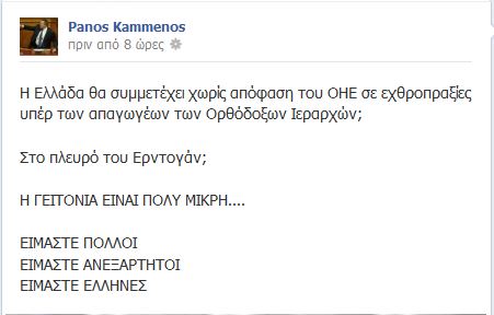 “Η Ελλάδα θα συμμετέχει χωρίς απόφαση του ΟΗΕ σε εχθροπραξίες υπέρ των απαγωγέων των Ορθόδοξων Ιεραρχών; Στο πλευρό του Ερντογάν; Η γειτονιά είναι πολύ μικρή…”, τονίζει ο Πρόεδρος των Ανεξάρτητων Ελλήνων Πάνος Καμμένος για τις εξελίξεις στη Συρία.