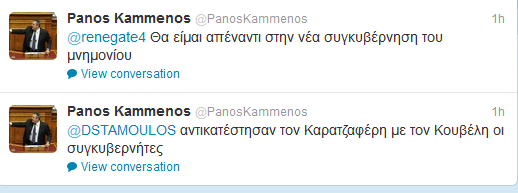 “Aντικατέστησαν τον Καρατζαφέρη με τον Κουβέλη οι συγκυβερνήτες”, έγραψε ο πρόεδρος των Ανεξάρτητων Ελλήνων, Πάνος Καμμένος, προσθέτοντας λίγο αργότερα, “Θα είμαι απέναντι στην νέα συγκυβέρνηση του μνημονίου”.