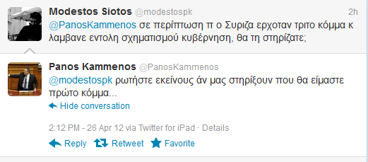 “Σε περίπτωση που ο ΣΥΡΙΖΑ ερχόταν τρίτο κόμμα και λαμβάνε εντολή σχηματισμού κυβέρνησης, θα τη στηρίζατε;” ρώτησαν τον πρόεδρο των Ανεξάρτητων Ελλήνων Πάνο Καμμένο μέσω Twitter.