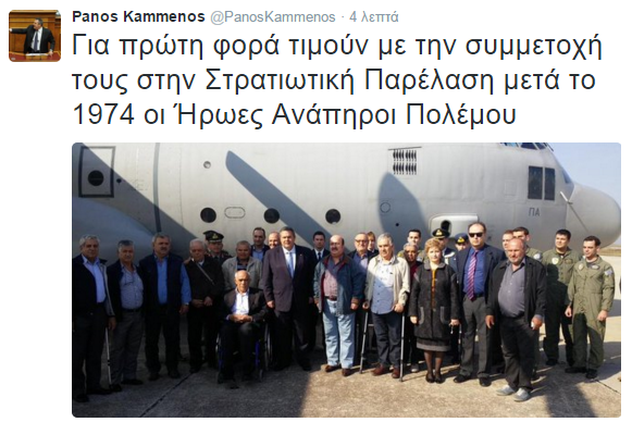Ο κ. Καμμένος, μάλιστα, ανέβασε φωτογραφίες μαζί με τους Ελληνοκύπριους Αγωνιστές του ’74 στον λογαριασμό του στο Twitter, γράφοντας: «Για πρώτη φορά τιμούν με την συμμετοχή τους στην Στρατιωτική Παρέλαση μετά το 1974 οι Ήρωες Ανάπηροι Πολέμου».