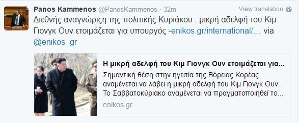 Την είδηση ότι η αδελφή του Κιμ Γιονγκ Ουν αναμένεται να αναλάβει σημαντική θέση στην ηγεσία της Βόρειας Κορέας σχολίασε μέσω του λογαριασμού του στο twitter, o πρόεδρος των ΑΝΕΛ και υπουργός Εθνικής Άμυνας Πάνος Καμμένος.