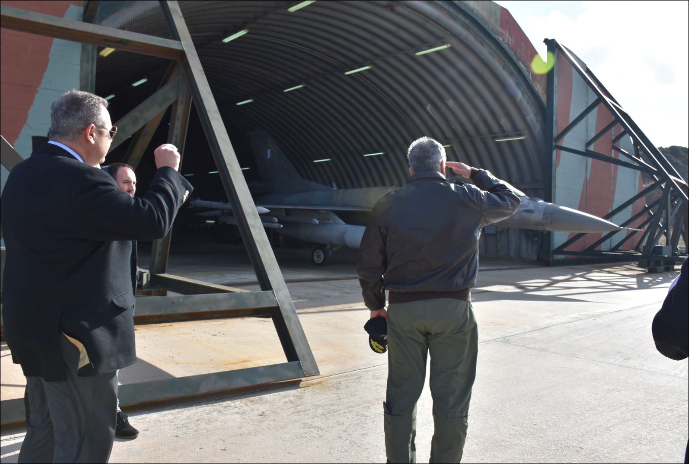 Ο φωτογραφικός φακός απαθανάτισε τον Πάνο Καμμένο να κάνει το σήμα του σταυρού προς τους πιλότους μας, που σε λίγα λεπτά θα ριχτούν ξανά στη «μάχη» της αναγνώρισης και της αναχαίτισης των τουρκικών αεροσκαφών. Στη φωτογραφία φαίνεται και ο αρχηγός ΓΕΑ Χρήστο Βαΐτσης, να αποδίδει τιμές στους φύλακες των αιθέρων μας.