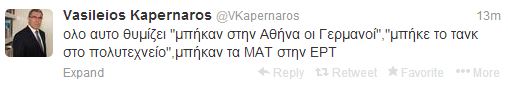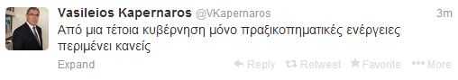 Με ένα “σκληρό” κείμενο στον λογαριασμό του στο twitter, σχολίασε ο Κοινοβουλευτικός Εκπρόσωπος των Ανεξάρτητων Ελλήνων Βασίλης Καπερνάρος τις εξελίξεις στην ΕΡΤ.