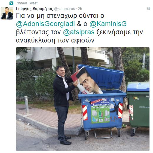 «Για να μη στεναχωριούνται ο @AdonisGeorgiadi & ο @KaminisG βλέποντας τον @atsipras ξεκινήσαμε την ανακύκλωση των αφισών», έγραψε χαρακτηριστικά στον προσωπικό του λογαριασμό, συνοδεύοντας την φωτογραφία.
