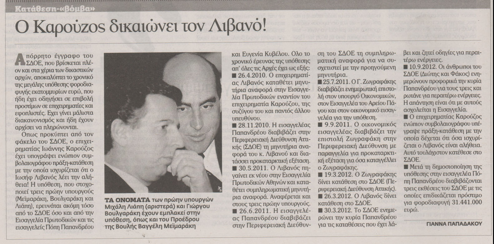 Το Κυριακάτικο “ΒΗΜΑ” αποκαλύπτει απόρρητο έγγραφο του ΣΔΟΕ που βρίσκεται στα χέρια των δικαστικών αρχών, από το οποίο προκύπτει ότι ο Ιωάννης Καρούζος έχει υπογράψει πράξη-κατάθεση με την οποία ισχυρίζεται ότι ο Ιωσήφ Λιβανός λέει την αλήθεια! Στο σχετικό ρεπορτάζ γράφει, μεταξύ άλλων, η Γιάννα Παπαδάκου : “όπως προκύπτει από τον φάκελο του ΣΔΟΕ, ο επιχειρηματίας Ιωάννης Καρούζος έχει υπογράψει ενώπιον συμβολαιογράφου πράξη-κατάθεση με την οποία ισχυρίζεται ότι ο Ιωσήφ Λιβανός λέει την αλήθεια”. Υπενθυμίζεται ότι ο ιωσήφ Λιβανός ενέπλεξε στην υπόθεση τον Πρόεδρο της Βουλής Βαγγέλη Μειμαράκη, τον Γιώργο Βουλγαράκη και τον Μιχάλη Λιάπη.