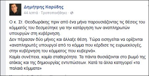 Επίθεση στον Σταύρο Θεοδωράκη εξαπέλυσε μέσω της προσωπικής του σελίδας στο Facebook, ο εκπρόσωπος Τύπου του ΠΑΣΟΚ Δημήτρης Καρύδης.