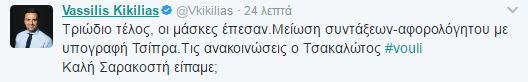 Με ανάρτησή του στο twitter o εκπρόσωπος Τύπου της ΝΔ, Βασίλης Κικίλιας σχολιάζει την επανέναρξη των διαπραγματεύσεων μεταξύ της κυβέρνησης και των εκπροσώπων των δανειστών.