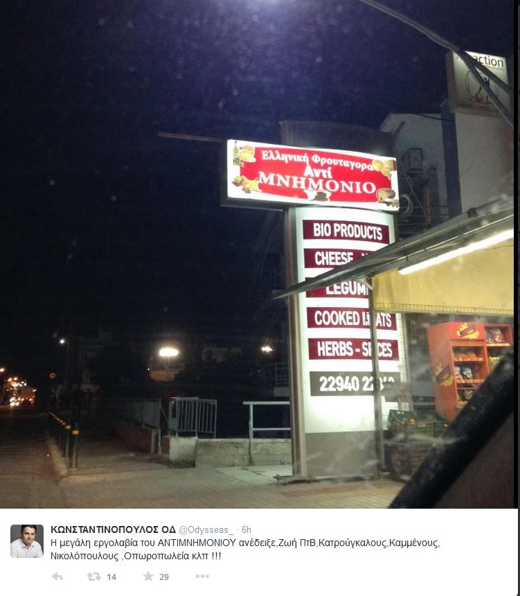Μία ανάρτηση με πολλά υπονοούμενα έκανε στο Twitter, ο βουλευτής του ΠΑΣΟΚ, Οδυσσέας Κωνσταντινόπουλος, κάνοντας αναφορά στην Ζωή Κωνσταντοπούλου, τον Γιώργο Κατρούγκαλο και ένα οπωροπωλείο. Συγκεκριμένα ο κ. Κωνσταντινόπουλος έγραψε: «Η μεγάλη εργολαβία του ΑΝΤΙΜΝΗΜΟΝΙΟΥ ανέδειξε, Ζωή ΠτΒ, Κατρούγκαλους, Καμμένους, Νικολόπουλους, Οπωροπωλεία κλπ».