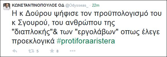 «Η κ Δούρου ψήφισε τον προϋπολογισμό του κ Σγουρού, του ανθρώπου της “διαπλοκής”& των “εργολάβων” οπως έλεγε προεκλογικά #protiforaaristera», αναφέρει το μήνυμα του υφυπουργού Ανάπτυξης.