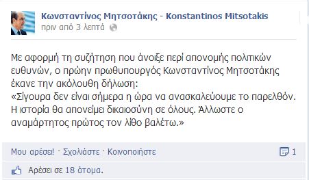 Με αφορμή τη συζήτηση που άνοιξε περί απονομής πολιτικών ευθυνών, ο πρώην Πρωθυπουργός Κωνσταντίνος Μητσοτάκης έκανε την ακόλουθη δήλωση: