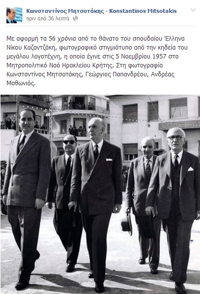 Ο επίτιμος πρόεδρος της Νέας Δημοκρατίας, Κωνσταντίνος Μητσοτάκης, με αφορμή τα 56 χρόνια από το θάνατο του Νίκου Καζαντζάκη, ανέβασε την παρακάτω φωτογραφία στον προσωπικό του λογαριασμό στο facebook.