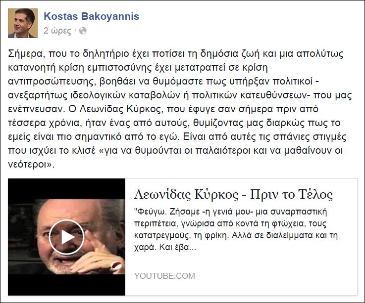 Ο Κώστας Μπακογιάννης, με ένα μήνυμά του στο Facebook, θέλησε να τιμήσει τον Λεωνίδα Κύρκο, που σαν σήμερα, πριν από τέσσερα χρόνια, “έφυγε” από την ζωή .