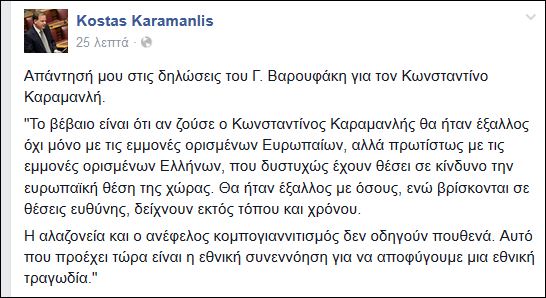 Την αντίδραση του Κώστα Καραμανλή προκάλεσαν οι δηλώσεις του Γιάνη Βαρουφάκη για τον Κωνσταντίνο Καραμανλή. Ο βουλευτής της Νέας Δημοκρατίας και ξάδερφος του πρώην πρωθυπουργού έγραψε στην προσωπική του σελίδα στο Facebook: