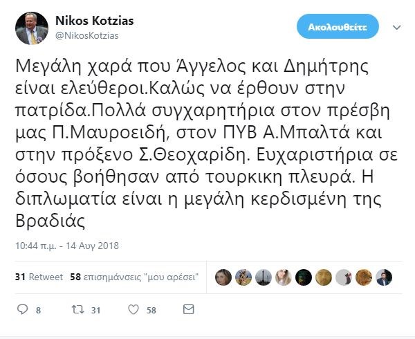 “Μεγάλη χαρά που ο Άγγελος και ο Δημήτρης είναι ελεύθεροι.Καλώς να έρθουν στην πατρίδα”, ανέφερε σε ανάρτησή του στο twitter ο Υπουργός Εξωτερικών Νίκος Κοτζιάς μετά την απελευθέρωση των Ελλήνων στρατιωτικών από τις φυλακές της Ανδριανούπολης.