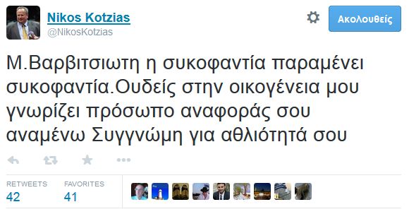 Η απάντηση στο twitter του Ν. Κοτζιά αναφέρει: