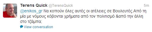 Δείτε τι έγραψε στο twitter ο βουλευτής των Ανεξάρτητων Ελλήνων, Τέρενς Κουίκ, για την καταγγελία αναγνώστη του enikos.gr, σύμφωνα με την οποία, τα μέλη του ελληνικού κοινοβουλίου, δεν πληρώνουν εισιτήριο στο Μουσείο της Ακρόπλης…
