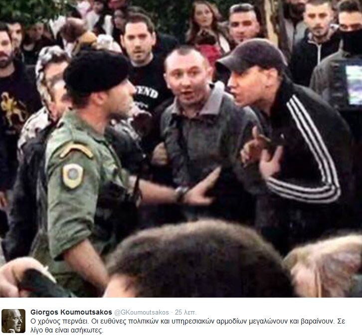 Ο κ.Κουμουτσάκος στη φωτογραφία που απεικονίζει έναν από τους δράστες της επίθεσης, σημειώνει: «Ο χρόνος περνάει. Οι ευθύνες πολιτικών και υπηρεσιακών αρμοδίων μεγαλώνουν και βαραίνουν. Σε λίγο θα είναι ασήκωτες».
