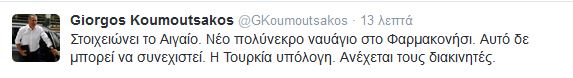 Την νέα τραγωδία στο ναυάγιο που σημειώθηκε τα ξημερώματα της Τετάρτης στο Φαρμακονήσι σχολίασε, μέσω Twitter, ο βουλευτής της ΝΔ Γιώργος Κουμουτσάκος.