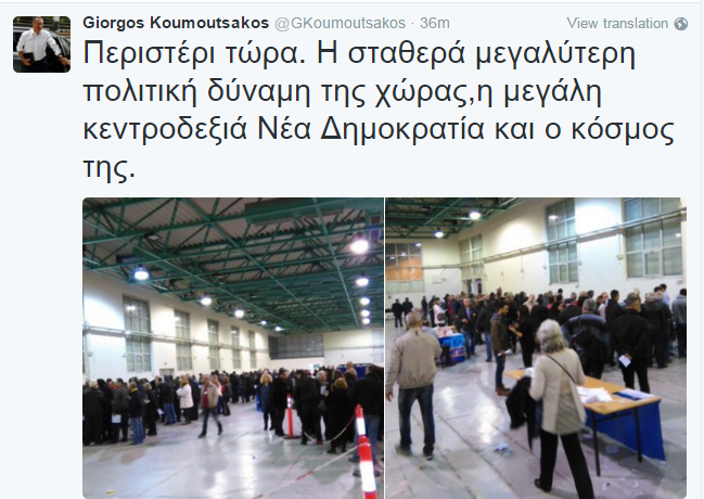 Φωτογραφίες από τις ουρές των ψηφοφόρων σε εκλογικό τμήμα στην περιοχή του Περιστερίου, ανέβασε στον προσωπικό του λογαριασμό στο Twitter, o Γιώργος Κουμουτσάκος και έγραψε: «Περιστέρι τώρα. Η σταθερά μεγαλύτερη πολιτική δύναμη της χώρας, η μεγάλη κεντροδεξιά Νέα Δημοκρατία και ο κόσμος της».