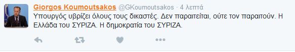 «Υπουργός υβρίζει όλους τους δικαστές. Δεν παραιτείται, ούτε τον παραιτούν. Η Ελλάδα του ΣΥΡΙΖΑ. Η δημοκρατία του ΣΥΡΙΖΑ», έγραψε στο Twitter ο εκπρόσωπος Τύπου της Νέας Δημοκρατίας, Γιώργος Κουμουτσάκος, για τη χθεσινή δήλωση του αναπληρωτή Υγείας, σε ομιλία του στο Περιστέρι, περί παραδικαστικών κυκλωμάτων.