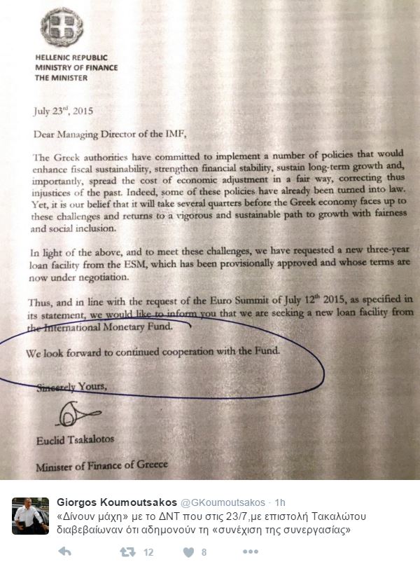 Eπιστολή του υπουργού Οικονομικών Ευκλείδη Τσακαλώτου με την οποία όπως επισημαίνει διαβεβαίωνε για συνέχιση της συνεργασίας με το ΔΝΤ, αποκαλύπτει ο Γιώργος Κουμουτσάκος.