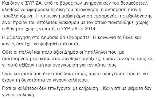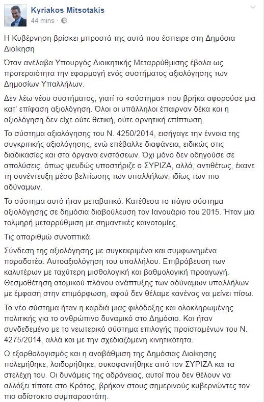 «Η αξιολόγηση στο Δημόσιο θα εφαρμοστεί. Η κοινωνία τη θέλει και κανείς δεν έχει να φοβηθεί από αυτό», γράφει μεταξύ άλλων ο πρόεδρος της Νέας Δημοκρατίας, ο οποίος υπενθυμίζει τι ίσχυε για την αξιολόγηση την εποχή που ανέλαβε υπουργός Διοικητικής Μεταρρύθμισης.Αναλυτικά η απάντηση του Κυριάκου Μητσοτάκη:«Όταν ανέλαβα Υπουργός Διοικητικής Μεταρρύθμισης έβαλα ως προτεραιότητα την εφαρμογή ενός συστήματος αξιολόγησης των Δημοσίων Υπαλλήλων.Δεν λέω νέου συστήματος, γιατί το «σύστημα» που βρήκα αφορούσε μια κατ’ επίφαση αξιολόγηση. Όλοι οι υπάλληλοι έπαιρναν δέκα και η αξιολόγηση δεν είχε ούτε θετική, ούτε αρνητική επίπτωση.Το σύστημα αξιολόγησης του Ν. 4250/2014, εισήγαγε την έννοια της συγκριτικής αξιολόγησης, και επέβαλλε διαφάνεια, ειδικά στις διαδικασίες και στα όργανα ενστάσεων. Όχι μόνο δεν οδηγούσε σε απολύσεις, όπως ψευδώς υποστήριζε ο ΣΥΡΙΖΑ, αλλά, αντιθέτως, έκανε τη συνέντευξη μέσο βελτίωσης των υπαλλήλων, ιδίως των πιο αδύναμων.Το σύστημα αυτό ήταν μεταβατικό. Κατέθεσα πρόταση για το πάγιο σύστημα αξιολόγησης σε δημόσια διαβούλευση τον Ιανουάριο του 2015. Ήταν μια τολμηρή μεταρρύθμιση με σημαντικές καινοτομίες.Τις απαριθμώ συνοπτικά. Σύνδεση της αξιολόγησης με συγκεκριμένα και συμφωνημένα παραδοτέα. Αυτοαξιολόγηση του υπαλλήλου. Επιβράβευση των καλύτερων με ταχύτερη μισθολογική και βαθμολογική προαγωγή. Θεσμοθέτηση ατομικού πλάνου ανάπτυξης των αδύναμων υπαλλήλων με έμφαση στην επιμόρφωση, αφού δεν θέλαμε κανένας να μείνει πίσω.Το νέο σύστημα ήταν η καρδιά μιας φιλόδοξης και ολοκληρωμένης πολιτικής για το ανθρώπινο δυναμικό στο Δημόσιο. Και ήταν συνδεδεμένο με το νεωτερικό σύστημα επιλογής προϊσταμένων του Ν. 4275/2014, αλλά και με την σχεδιαζόμενη κινητικότητα.Ο εξορθολογισμός και η αναβάθμιση της Δημόσιας Διοίκησης πολεμήθηκε, λοιδορήθηκε, συκοφαντήθηκε από τον ΣΥΡΙΖΑ και τα στελέχη του. Οι δυνάμεις της αδράνειας, αυτοί που δεν θέλουν να αλλάξει τίποτε στο Κράτος, βρήκαν στους σημερινούς κυβερνώντες τον πιο αδίστακτο συμπαραστάτη.Και όταν ο ΣΥΡΙΖΑ, κάτω από το βάρος των μνημονιακών του δεσμεύσεων, κλήθηκε να εφαρμόσει τη δική του αξιολόγηση, η αντίδραση ήταν η προβλεπόμενη. Η σημερινή μαζική άρνηση εφαρμογής της αξιολόγησης είναι προϊόν του απόλυτου λαϊκισμού με τον οποίο πολιτεύθηκε, χωρίς ευθύνη και χωρίς ντροπή, ο ΣΥΡΙΖΑ το 2014.Η αξιολόγηση στο Δημόσιο θα εφαρμοστεί. Η κοινωνία τη θέλει και κανείς δεν έχει να φοβηθεί από αυτό. Ούτε οι πολλοί και πολύ άξιοι Δημόσιοι Υπάλληλοι που, με αυταπάρνηση και κάτω από συνθήκες αντίξοες, τιμούν τον όρκο τους και γι’ αυτό αξίζουν τιμή και αναγνώριση για τον κόπο τους.Ούτε και αυτοί που δεν αποδίδουν όπως πρέπει και γι’ αυτό πρέπει να έχουν τη δυνατότητα να γίνουν καλύτεροι. Γιατί οι καλύτεροι δεν επιλέγονται με κλήρωση… Και γιατί με ψέματα δεν γίνεται πολιτική.