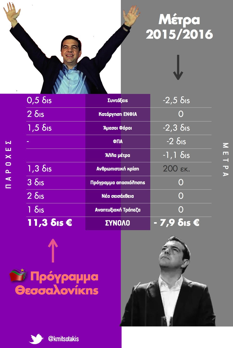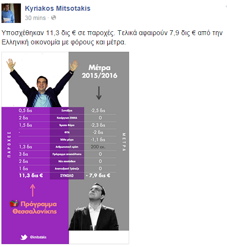 Δημόσια ανάρτηση έκανε στο προσωπικό του λογαριασμό στο facebook, ο κοινοβουλευτικός εκπρόσωπος της Νέας Δημοκρατίας, Κυριάκος Μητσοτάκης, συγκρίνοντας τα όσα υποσχέθηκε το κόμμα του ΣΥΡΙΖΑ, στη Διεθνή Έκθεση της Θεσσαλονίκης και σε όσα μέτρα τελικά φαίνεται να παίρνει, σύμφωνα με τις τελευταίες εξελίξεις των διαπραγματεύσεων.