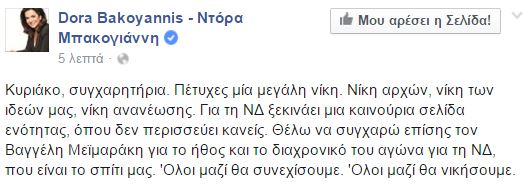 “Κυριάκο, συγχαρητήρια. Πέτυχες μία μεγάλη νίκη. Νίκη αρχών, νίκη των ιδεών μας, νίκη ανανέωσης. Για τη ΝΔ ξεκινάει μια καινούρια σελίδα ενότητας, όπου δεν περισσεύει κανείς. Θέλω να συγχαρώ επίσης τον Βαγγέλη Μεϊμαράκη για το ήθος και το διαχρονικό του αγώνα για τη ΝΔ, που είναι το σπίτι μας. ‘Ολοι μαζί θα συνεχίσουμε. ‘Ολοι μαζί θα νικήσουμε” έγραψε στο Facebook.