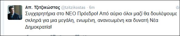 Μπορεί η καταμέτρηση των ψηφοδελτίων να βρισκόταν σε εξέλιξη, όμως, ο Απόστολος Τζιτζικώστας έδωσε μέσω Twitter συγχαρητήρια στο νέο πρόεδρο, χωρίς να τον κατονομάσει.