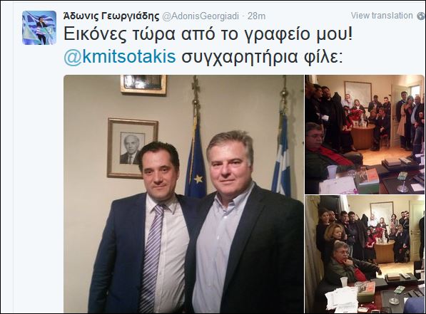 Ο Άδωνις Γεωργιάδης έδωσε μέσω Twitter συγχαρητήρια στον Κυριάκο Μητσοτάκη για την εκλογή του στην προεδρία της Νέας Δημοκρατίας. “Συγχαρητήρια φίλε”, έγραψε ο βουλευτής της ΝΔ στον ανεβάζοντας φωτογραφίες από το γραφείο του.