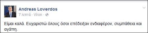 «Είμαι καλά. Ευχαριστώ όλους όσοι επέδειξαν ενδιαφέρον, συμπάθεια και αγάπη», έγραψε ο κ. Λοβέρδος.