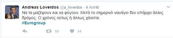 Σφοδρή επίθεση στην Κυβέρνηση εξαπέλυσε μέσω ανάρτησης στο προφίλ του στο Twitter μετά το τέλος του Eurogroup o κοινοβουλευτικός εκπρόσωπος της Δημοκρατικής Συμπαράταξης, Ανδρέας Λοβέρδος.Ο κ. Λοβέρδος καλεί την κυβέρνηση ΣΥΡΙΖΑ-ΑΝΕΛ να φύγει κάνοντας λόγο για«ναυάγιο» στο σημερινό Eurgroup. «Να τα μαζέψουν και να φύγουν. Μετά το σημερινό ναυάγιο δεν υπάρχει άλλος δρόμος. Ο χρόνος ούτως ή άλλως χάνεται», ανέφερε ο κ. Λοβέρδος.Δείτε το tweet του Ανδρέα Λοβέρδου: