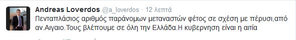 Επίθεση στην κυβέρνηση εξαπολύει ο βουλευτής του ΠΑΣΟΚ, Ανδρέας Λοβέρδος, μέσω του προσωπικού του λογαριασμού στο Twitter, με αφορμή την είσοδο των παράνομων μεταναστών στη χώρα μας. Συγκεκριμένα, ο Ανδρέας Λοβέρδος γράφει: «Πενταπλάσιος αριθμός παράνομων μεταναστών φέτος σε σχέση με πέρυσι, από ανατολικό Αιγαίο. Τους βλέπουμε σε όλη την Ελλάδα. Η κυβέρνηση είναι η αιτία».