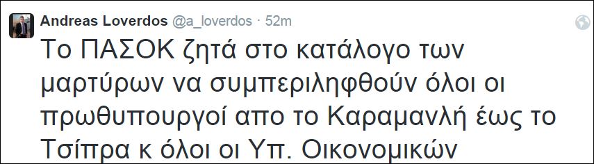 Μάλιστα, όπως ενημέρωσε ο κ. Λοβέδρος, μέσω twitter, το ΠΑΣΟΚ ζήτησε στο κατάλογο των μαρτύρων να συμπεριληφθούν όλοι οι πρωθυπουργοί από τον Κώστα Καραμανλή έως τον Αλέξη Τσίπρα και όλοι οι Υπουργοί Οικονομικών.