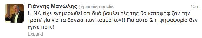 “Η ΝΔ είχε ενημερωθεί ότι δύο βουλευτές της θα καταψήφιζαν την τροπολογία για τα δάνεια των κομμάτων”, σχολιάζει στο twitter ο Γιάννης Μανώλης…