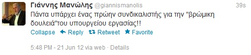 «Πάντα υπάρχει ένας πρώην συνδικαλιστής για την “βρώμικη δουλειά” του υπουργείου εργασίας!», έγραψε στο twitter, ο Γιάννης Μανώλης.
