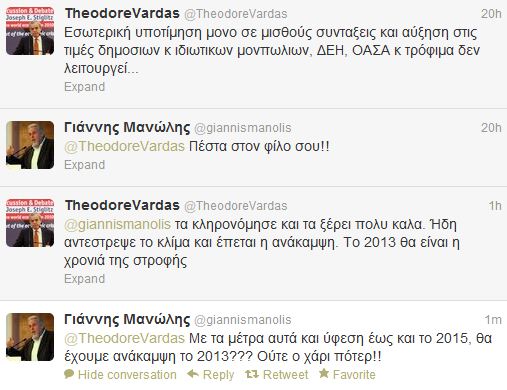 Πρώην “συμπολεμιστές” νυν αντίπαλοι, ο Γιάννης Μανώλης και ο Θεόδωρος Βάρδας ξιφουλκούν για τα νέα μέτρα. Η συζήτησή τους αποκτά ιδιαίτερο ενδιαφέρον, αφού έμμεσα μνημονεύεται και ο πρωθυπουργός. Η συζήτηση έγινε στο twitter.